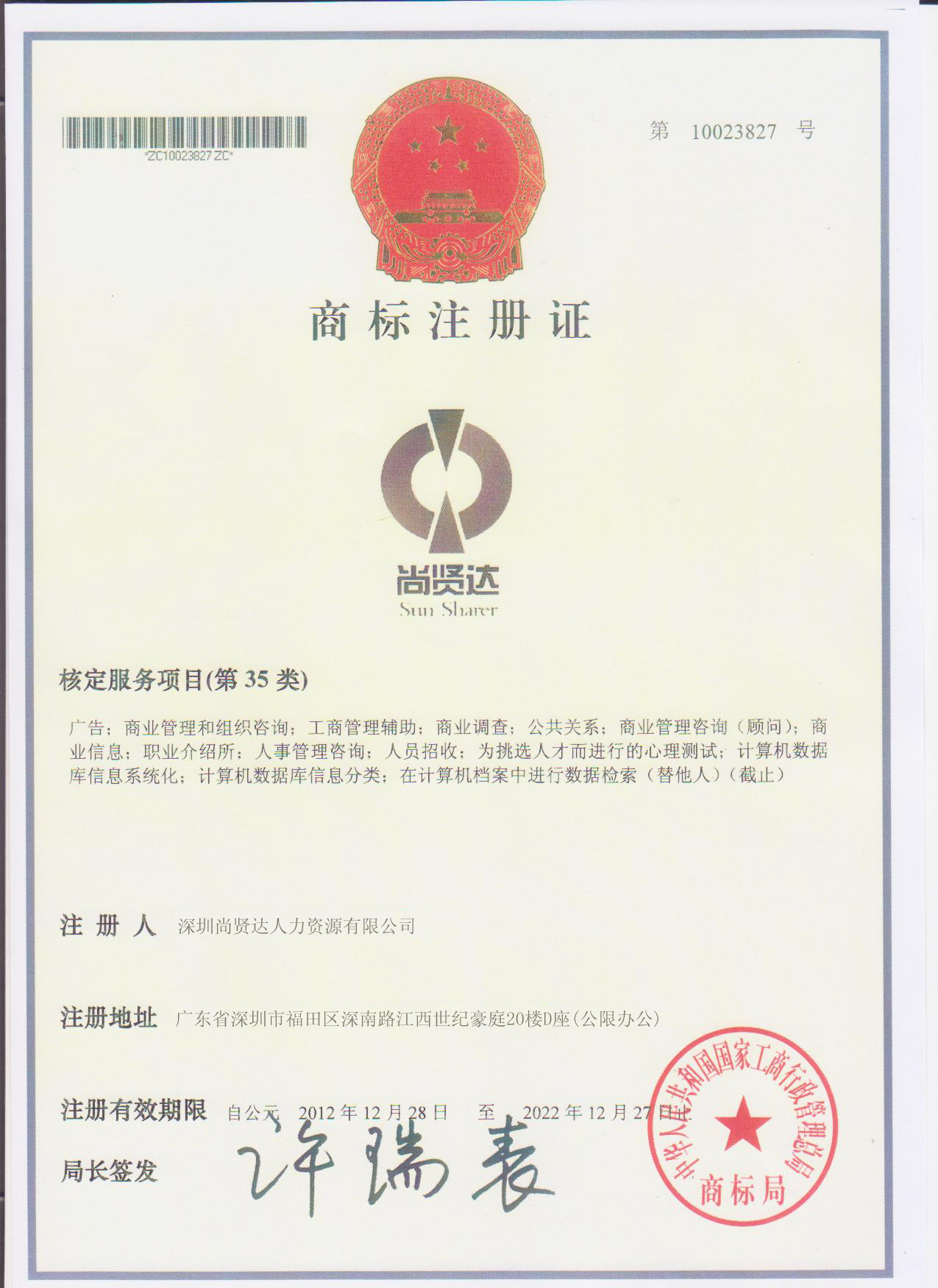 尚賢達獵頭公司商標注冊證書